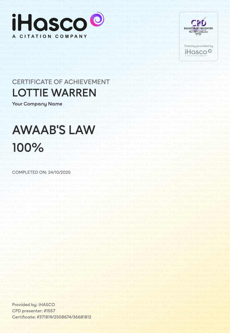 Your Awaab’s Law Training Certificate includes your name, company name (if applicable), name of course taken, pass percentage, date of completion, expiry date and stamps of approval or accreditations by recognised authorities.