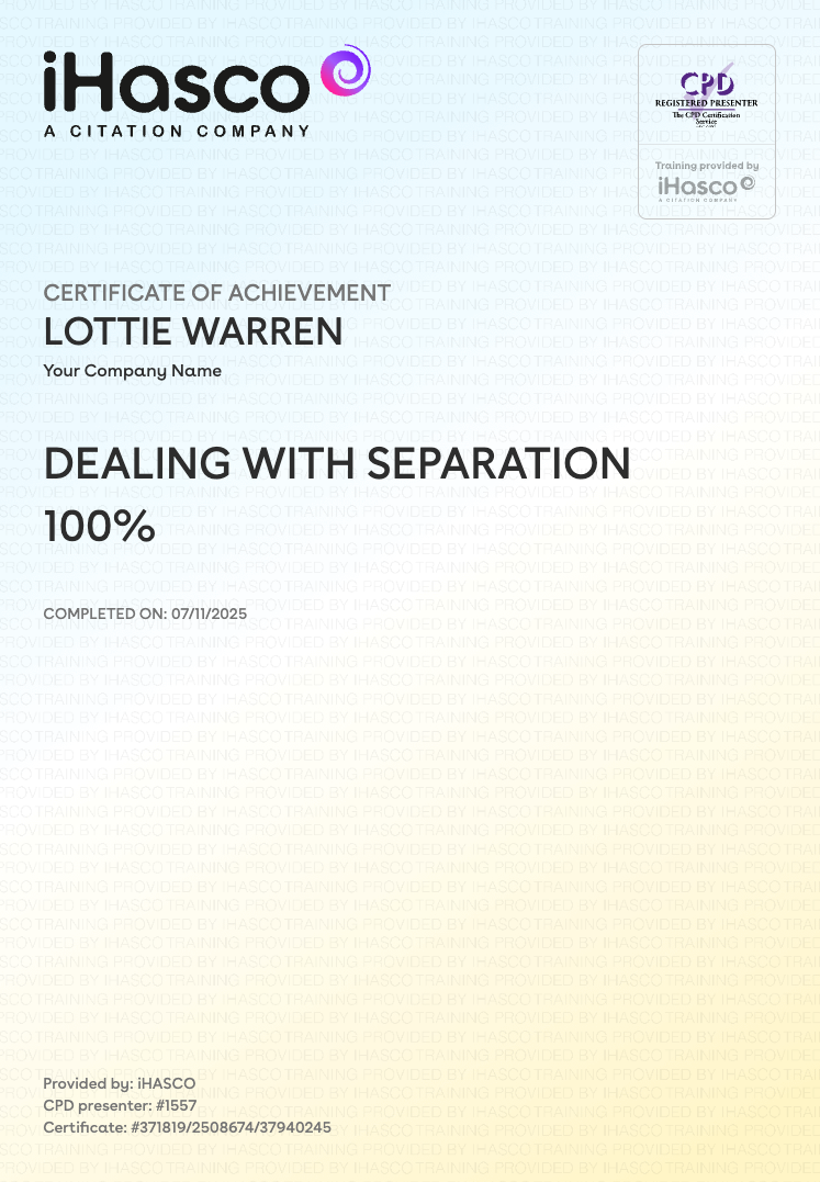 Your Dealing with Separation Training Certificate includes your name, company name (if applicable), name of course taken, pass percentage, date of completion, expiry date and stamps of approval or accreditations by recognised authorities.