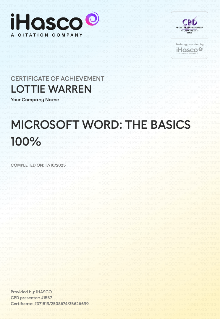 Your Microsoft Word: The Basics Training Certificate includes your name, company name (if applicable), name of course taken, pass percentage, date of completion, expiry date and stamps of approval or accreditations by recognised authorities.