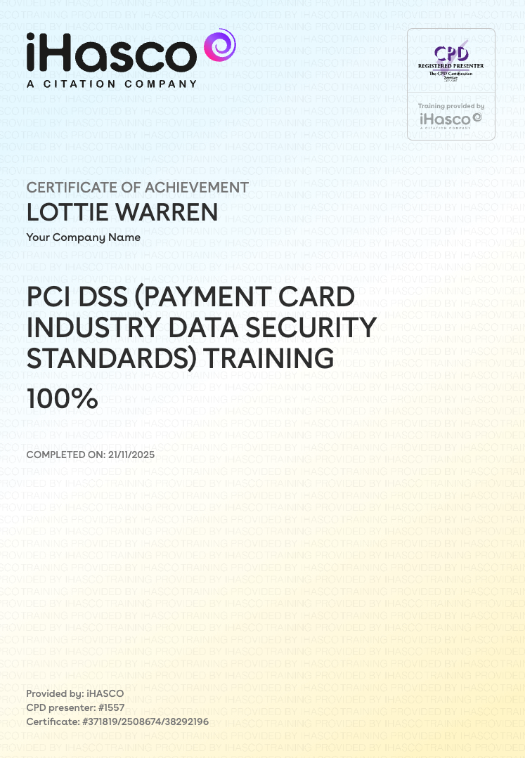 Your PCI DSS Certificate includes your name, company name (if applicable), name of course taken, pass percentage, completion date, expiry date and all relevant approvals.