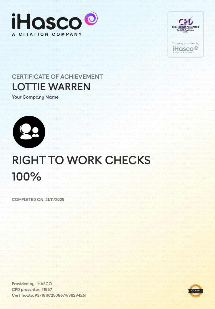 Right to Work Checks Training certificate
