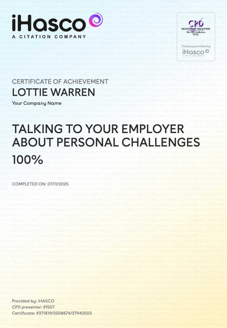 Your Talking to Your Employer About Personal Challenges Training Certificate includes your name, company name (if applicable), name of course taken, pass percentage, date of completion, expiry date and stamps of approval or accreditations by recognised authorities.