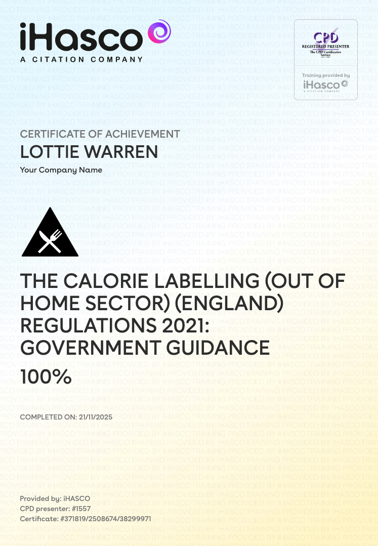 The Calorie Labelling (Out of Home Sector) (England) Regulations 2021 Training certificate